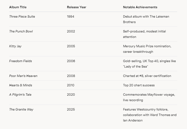 His 2005 album Kitty Jay earned a Mercury Music Prize nomination, marking his rise in folk music. Freedom Fields (2006) became a gold-selling hit, charting in the UK Top 40. Over the years, albums like Poor Man’s Heaven (2008) and A Pilgrim’s Tale (2020) showcased his storytelling, often rooted in Westcountry folklore.